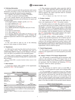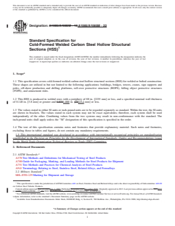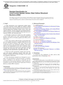 ABSTRACT This specification covers cold-formed welded carbon steel hollow structural sections (HSS) for welded or bolted construction that are used in, although not limited to, buildings, bridges, towers, cranes, sign supports and poles, off-shore production and drilling platforms, roll-over protective structures (ROPS), falling object protective structures (FOPS), and amusement rides. This HSS is produced in welded sizes with a periphery of not more than 88 in. [2235 mm] as well as a specified nominal wall thickness of at least 0.148 in. [3.8 mm] and not more than 0.875 in. [22 mm]. The standard addresses areas such as ordering information, the steel-making process, HSS manufacture, heat analysis, product analysis, tensile requirements, flattening test, permissible variations in dimensions, number of tests, retests, test methods, rejection, certification, product marking, packing and loading, and government procurement. SCOPE 1.1 This specification covers cold-formed welded carbon steel hollow structural sections (HSS) for welded or bolted construction. These shapes are utilized in but not limited to the following applications: buildings, bridges, towers, cranes, sign supports and poles, off-shore production and drilling platforms, roll-over protective structures (ROPS), falling object protective structures (FOPS), and amusement rides. 1.2 This HSS is produced in welded sizes with a periphery of 88 in. [2235 mm] or less, and a specified nominal wall thickness of 0.148 in. [3.8 mm] or greater and 1.000 in. [25.4 mm] or less. 1.3 The values stated in either SI units or inch-pound units are to be regarded separately as standard. Within the text, the SI units are shown in brackets. The values stated in each system may not be exact equivalents; therefore, each system shall be used independently of the other. Combining values from the two systems may result in non-conformance with the standard. The inch-pound units shall apply unless the “M” designation of this specification is specified in the order. 1.4 The text of this specification contains notes and footnotes that provide explanatory material. Such notes and footnotes, excluding those in tables and figures, do not contain any mandatory requirements. 1.5 This international standard was developed in accordance with internationally recognized principles on standardization established in the Decision on Principles for the Development of International Standards, Guides and Recommendations issued by the World Trade Organization Technical Barriers to Trade (TBT) Committee.