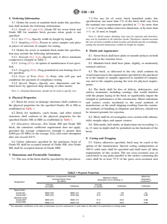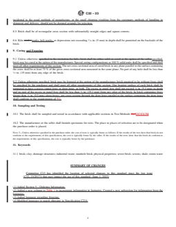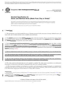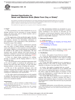 ASTM C32-23 is a technical specification published by ASTM International. Its full title is "Standard Specification for Sewer and Manhole Brick (Made From Clay or Shale)". This standard covers: ABSTRACT This specification covers brick intended for use in drainage structures for the conveyance of sewage, industrial wastes, and storm water, and related structures such as manholes and catch basins. The bricks are classified as sewer bricks (Grades SS and SM) and manhole bricks (Grades MS and MM). Sewer brick shall have plain or smooth surfaces on both ends and on the face side. Manhole brick shall have plain, slightly, or moderately textured surfaces. The brick shall be sampled and tested in accordance with applicable requirements specified. SCOPE 1.1 This specification covers brick intended for use in (1) drainage structures for the conveyance of sewage, industrial wastes, and storm water, and (2) related structures such as manholes and catch basins. 1.2 The requirements of this specification apply at the time of purchase. The use of results from testing of brick extracted from masonry structures for determining conformance or non-conformance to the requirements of this specification is beyond the scope of this standard. 1.3 Brick are ceramic products manufactured primarily from clay, shale, or similar naturally occurring earthy substances and subjected to a heat treatment at elevated temperatures (firing). Additives or recycled materials are permitted to be included at the option of the manufacturer. The heat treatment must develop sufficient fired bond between the particulate constituents to provide the strength and durability requirements of this specification. (See Terminology C1232.) 1.4 Brick are shaped during manufacture by molding, pressing, or extrusion, and the shaping method is a way to describe the brick. 1.4.1 This specification and its individual requirements shall not be used to qualify or corroborate the performance of a masonry unit made from other materials, or made with other forming methods, or other means of binding the materials. 1.5 The text of this specification references notes and footnotes which provide explanatory material. These notes and footnotes, excluding those in tables and figures, shall not be considered as requirements of the specification. 1.6 The values stated in inch-pound units are to be regarded as standard. The values given in parentheses are mathematical conversions to SI units that are provided for information only and are not considered standard. 1.7 This international standard was developed in accordance with internationally recognized principles on standardization established in the Decision on Principles for the Development of International Standards, Guides and Recommendations issued by the World Trade Organization Technical Barriers to Trade (TBT) Committee.