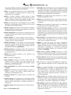 SCOPE 1.1 This terminology and acronyms standard covers and defines commonly used terms and acronyms in the field of corrosion. Related terms may be found in Terminologies D16, D4538, G40, or other ASTM terminology standards. 1.2 This terminology and acronyms standard is a result of an agreement between NACE International and ASTM International Committee G01 on Corrosion of Metals and may not reflect the opinions of other ASTM committees. 1.3 In this terminology and acronyms standard, brackets are used for directives that follow a definition and are obviously not part of it, such as, “[see XXX]” and “[also known as XXX].” Brackets can also indicate the field of application or context of the definition or acronym. 1.4 This international standard was developed in accordance with internationally recognized principles on standardization established in the Decision on Principles for the Development of International Standards, Guides and Recommendations issued by the World Trade Organization Technical Barriers to Trade (TBT) Committee.