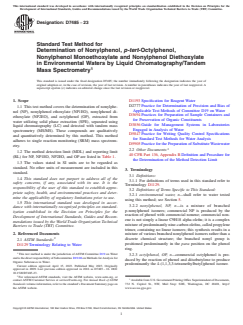 ASTM D7485-23 is a standard published by ASTM International. Its full title is "Standard Test Method for Determination of Nonylphenol, <emph type="bdit">p-tert</emph >-Octylphenol, Nonylphenol Monoethoxylate and Nonylphenol Diethoxylate in Environmental Waters by Liquid Chromatography/Tandem Mass Spectrometry". This standard covers: SIGNIFICANCE AND USE 5.1 NP and OP have been shown to have toxic effects in aquatic organisms. The source of NP and OP is prominently from the use of common commercial surfactants. The most widely used surfactant is nonylphenol ethoxylate (NPEO) which has an average ethoxylate chain length of nine. The ethoxylate chain is readily biodegraded to form NP1EO, NP2EO, nonylphenol carboxylate (NPEC) and, under anaerobic conditions, NP. NP will also biodegrade, but may be released into environmental waters directly at trace levels. This method has been investigated and is applicable for environmental waters, including seawater. SCOPE 1.1 This test method covers the determination of nonylphenol (NP), nonylphenol ethoxylate (NP1EO), nonylphenol diethoxylate (NP2EO), and octylphenol (OP), extracted from water utilizing solid phase extraction (SPE), separated using liquid chromatography (LC) and detected with tandem mass spectrometry (MS/MS). These compounds are qualitatively and quantitatively determined by this method. This method adheres to single reaction monitoring (SRM) mass spectrometry. 1.2 The method detection limit (MDL) and reporting limit (RL) for NP, NP1EO, NP2EO, and OP are listed in Table 1. 1.3 The values stated in SI units are to be regarded as standard. No other units of measurement are included in this standard. 1.4 This standard does not purport to address all of the safety concerns, if any, associated with its use. It is the responsibility of the user of this standard to establish appropriate safety, health, and environmental practices and determine the applicability of regulatory limitations prior to use. 1.5 This international standard was developed in accordance with internationally recognized principles on standardization established in the Decision on Principles for the Development of International Standards, Guides and Recommendations issued by the World Trade Organization Technical Barriers to Trade (TBT) Committee.