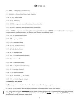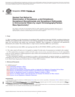 SIGNIFICANCE AND USE 5.1 NP and OP have been shown to have toxic effects in aquatic organisms. The source of NP and OP is prominently from the use of common commercial surfactants. The most widely used surfactant is nonylphenol ethoxylate (NPEO) which has an average ethoxylate chain length of nine. The ethoxylate chain is readily biodegraded to form NP1EO, NP2EO, nonylphenol carboxylate (NPEC) and, under anaerobic conditions, NP. NP will also biodegrade, but may be released into environmental waters directly at trace levels. This method has been investigated and is applicable for environmental waters, including seawater. SCOPE 1.1 This test method covers the determination of nonylphenol (NP), nonylphenol ethoxylate (NP1EO), nonylphenol diethoxylate (NP2EO), and octylphenol (OP), extracted from water utilizing solid phase extraction (SPE), separated using liquid chromatography (LC) and detected with tandem mass spectrometry (MS/MS). These compounds are qualitatively and quantitatively determined by this method. This method adheres to single reaction monitoring (SRM) mass spectrometry. 1.2 The method detection limit (MDL) and reporting limit (RL) for NP, NP1EO, NP2EO, and OP are listed in Table 1. 1.3 The values stated in SI units are to be regarded as standard. No other units of measurement are included in this standard. 1.4 This standard does not purport to address all of the safety concerns, if any, associated with its use. It is the responsibility of the user of this standard to establish appropriate safety, health, and environmental practices and determine the applicability of regulatory limitations prior to use. 1.5 This international standard was developed in accordance with internationally recognized principles on standardization established in the Decision on Principles for the Development of International Standards, Guides and Recommendations issued by the World Trade Organization Technical Barriers to Trade (TBT) Committee.