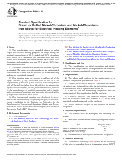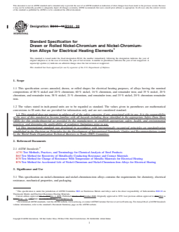 SCOPE 1.1 This specification covers annealed, drawn, or rolled shapes for electrical heating purposes, of alloys having the nominal compositions of 80 % nickel and 20 % chromium; 60 % nickel, 16 % chromium, and remainder iron; and 35 % nickel, 20 % chromium, and remainder iron; 38 % nickel, 21 % chromium, and remainder iron; and 35 % nickel, 20 % chromium remainder iron. 1.2 The values stated in inch-pound units are to be regarded as standard. The values given in parentheses are mathematical conversions to SI units that are provided for information only and are not considered standard. 1.3 This standard does not purport to address all of the safety concerns, if any, associated with its use. It is the responsibility of the user of this standard to become familiar with all hazards including those identified in the appropriate Safety Data Sheet (SDS) for this product/material as provided by the manufacturer, to establish appropriate safety, health, and environmental practices, and determine the applicability of regulatory limitations prior to use. 1.4 This international standard was developed in accordance with internationally recognized principles on standardization established in the Decision on Principles for the Development of International Standards, Guides and Recommendations issued by the World Trade Organization Technical Barriers to Trade (TBT) Committee.