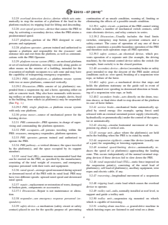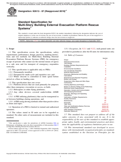 This specification covers the specifications, safety requirements, performance, design, practices, marking instructions and test methods for multi-story building external evacuation platform rescue systems (PRS) for emergency escape of persons who cannot use the normal means of egress to a safe area and for vertical transport of emergency responders. This specification is applicable only to PRSs that are permanently installed, designed for multi-cycle and repetitive use, and where descent is controlled to limit speed before arrival at a floor or landing zone. Conversely, this specification does not cover platform devices that are used primarily for purposes other than emergency evacuation and/or access, helicopters or other flying platforms, a PRS utilizing platforms that can be transported to or between buildings during operations, and a PRS using driving methods other than positive drive as drum and ropes.