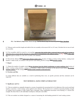 SIGNIFICANCE AND USE 4.1 This test method was originally designed as a means of quantitatively measuring the level of adhesion of the wood-wood interface caused by a wood coatings system applied to the substrate. The tensile test is useful in measuring bonding strength of coatings, such as gymnasium coatings, in which the wood strip flooring primarily expands or contracts in response to changes across the cross-sectional width of the strip floor. 4.2 This test method was further designed as a means of measuring the side-bonding potential of wood coating systems. SCOPE 1.1 These test methods describe an evaluation procedure for the determination of undesirable side-bonding of coatings for wood flooring. They provide two mechanical properties tests for the quantitative determination of the cohesive strength of wood coatings (tensile and lap shear). 1.2 The values stated in inch-pound units are to be regarded as standard. The values given in parentheses are mathematical conversions to SI units that are provided for information only and are not considered standard. 1.3 This standard does not purport to address all of the safety concerns, if any, associated with its use. It is the responsibility of the user of this standard to establish appropriate safety, health, and environmental practices and determine the applicability of regulatory limitations prior to use. 1.4 This international standard was developed in accordance with internationally recognized principles on standardization established in the Decision on Principles for the Development of International Standards, Guides and Recommendations issued by the World Trade Organization Technical Barriers to Trade (TBT) Committee.