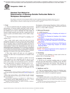 ASTM D4600-22 is a standard published by ASTM International. Its full title is "Standard Test Method for Determination of Benzene-Soluble Particulate Matter in Workplace Atmospheres". This standard covers: SIGNIFICANCE AND USE 5.1 This test method provides a means of evaluating exposures to benzene-soluble particulate matter in a concentration range that can be related to occupational exposures. SCOPE 1.1 This test method describes the sampling and gravimetric determination of benzene-soluble particulate matter that has become airborne as a result of certain industrial processes. This test method can be used to determine the total weight of benzene-soluble materials and to provide a sample that may be used for specific and detailed analyses of the soluble components. 1.2 The limit of detection is 0.05 mg/m3 by sampling a 1 m3 volume of air. Note 1: Other volatile organic solvents have been used for this determination and whereas a less toxic solvent for this analysis might be desirable, the substitution of a solvent other than benzene is unwise at this time. A tremendous volume of environmental sampling data based on benzene-soluble determinations has been accumulated over many years in several industries.2 Some of the determinations have been used in epidemiological studies. Furthermore, the use of benzene is specified in existing United States federal standards.3 As a result, it appears imprudent to use a different solvent until the qualitative and quantitative relationship of analyses derived from benzene and a substitute solvent is established. With proper care, benzene can be safely used in the laboratory. 1.3 The values stated in SI units are to be regarded as standard. No other units of measurement are included in this standard. 1.4 This standard does not purport to address all of the safety concerns, if any, associated with its use. It is the responsibility of the user of this standard to establish appropriate safety, health, and environmental practices and determine the applicability of regulatory limitations prior to use. 1.5 This international standard was developed in accordance with internationally recognized principles on standardization established in the Decision on Principles for the Development of International Standards, Guides and Recommendations issued by the World Trade Organization Technical Barriers to Trade (TBT) Committee.