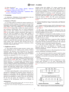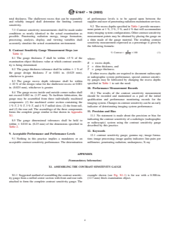 SIGNIFICANCE AND USE 5.1 The contrast sensitivity gauge measures contrast sensitivity independent of the imaging system spatial resolution limitations. The thickness recess dimensions of the contrast sensitivity gauge are large with respect to the unsharpness limitations of most imaging systems. Four levels of contrast sensitivity are measured: 4 %, 3 %, 2 %, and 1 %. 5.2 The contrast sensitivity gauge is intended for use in conjunction with a high-contrast resolution measuring gauge, such as Practice E2002, ISO 19232 – 5 Duplex Wire Image Quality Indicator7, or a line-pair gauge. Such gauges measure system unsharpness essentially independent of the imaging system's contrast sensitivity. Such measurements are appropriate for the qualification and performance monitoring of radiographic and radioscopic imaging systems with film, realtime devices, Computed Radiography (CR) and Digital Detector Arrays (DDA). 5.3 Radioscopic/radiographic system performance may be specified by combining the measured contrast sensitivity expressed as a percentage with the unsharpness expressed in millimetres of unsharpness. For the duplex wire image quality indicator, the unsharpness is equal to twice the wire diameter. For the line pair gauge, the unsharpness is equal to the reciprocal of the line-pair/mm value. As an example, an imaging system that exhibits 2 % contrast sensitivity and images the 0.1 mm paired wires of the duplex wire IQI (equivalent to imaging 5 line-pairs/millimeter resolution on a line-pair gauge) performs at a 2 %–0.2 mm sensitivity level. A standard method of evaluating overall radioscopic system performance is given in Practice E1411 and in EN 13068–1. A conversion table from duplex wire read out to lp/mm can be found in Practice E2002. For CR system performance evaluation, this contrast sensitivity gauge is used in Practice E2445. SCOPE 1.1 This practice covers the design and material selection of a contrast sensitivity measuring gauge used to determine the minimum change in material thickness or density that may be imaged without regard to unsharpness limitations. 1.2 This practice is applicable to transmitted-beam radiographic imaging systems (film, radioscopy, computed radiography, and digital detector array image detectors) utilizing X-ray and gamma ray radiation sources. 1.3 The values stated in inch-pound units are to be regarded as standard. The SI units given in parentheses are for information only. 1.4 This standard does not purport to address all of the safety concerns, if any, associated with its use. It is the responsibility of the user of this standard to establish appropriate safety, health, and environmental practices and determine the applicability of regulatory limitations prior to use. For specific safety statements, see NIST/ANSI Handbook 114 Section 8, Code of Federal Regulations 21 CFR 1020.40 and 29 CFR 1910.96. 1.5 This international standard was developed in accordance with internationally recognized principles on standardization established in the Decision on Principles for the Development of International Standards, Guides and Recommendations issued by the World Trade Organization Technical Barriers to Trade (TBT) Committee.