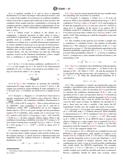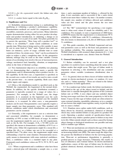 SIGNIFICANCE AND USE 4.1 Reliability demonstration testing is a methodology for qualifying or validating a product’s performance capability. Demonstration methods are useful for components, devices, assemblies, materials, processes, and systems. Many industries require demonstration testing either for new product development and product introduction, in validating a change to an existing product or as part of an audit. Test plans generally try to answer the questions, “How long will a product last?” or “What is its reliability?”, under stated conditions at some specific time. When time is being used as a life variable, it must be cast in some kind of “time” units. Typical time units are hours (or minutes), cycles of usage, calendar time or some variation of these. In certain cases, “time” can be accelerated in order to reduce a plan’s completion time. In the automotive industry mileage may be used as the time variable. Certain means of accelerating tests involve the use of increased power, voltage, mechanical load, humidity, vibration, or temperature (often in the form of thermal cycling). 4.2 Two fundamental objectives in reliability test planning are: (a) demonstrating that a product meets a specific life requirement, and (b) demonstrating what a product can do – its life capability. In the first case, a requirement is specified; in the second case a series of test results are used to state a result at the present time – its current capability. Both cases share similar inputs and outputs. 4.3 Often a life distribution model is specified such as the Weibull, the exponential, the lognormal or the normal distribution. In addition, for the specific distribution assumed, a parameter is typically assumed (or a range of values for a parameter). For example, in the Weibull case, the shape parameter, β, is assumed; in the lognormal case the scale parameter, σ, is assumed and in the normal case the standard deviation, σ, is assumed. In other cases, a non-parametric analysis can be used. N... SCOPE 1.1 This standard covers fundamental concepts, applications and mathematical relationships associated with the planning of reliability demonstration tests as applied to components and materials testing. 1.2 The system of units for this guide is not specified. Quantities and examples are presented only as illustrations of a method or a calculation. Any examples used are not binding on any particular product or industry. 1.3 This standard does not purport to address all of the safety concerns, if any, associated with its use. It is the responsibility of the user of this standard to establish appropriate safety, health, and environmental practices and determine the applicability of regulatory limitations prior to use. 1.4 This international standard was developed in accordance with internationally recognized principles on standardization established in the Decision on Principles for the Development of International Standards, Guides and Recommendations issued by the World Trade Organization Technical Barriers to Trade (TBT) Committee.