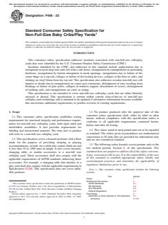 1.1 This consumer safety specification establishes testing requirements for structural integrity and performance requirements for non-full-size cribs/play yards, both rigid sided and mesh/fabric assemblies. It also provides requirements for labeling and instructional material. The term unit or product will refer to a non-full-size crib/play yard.