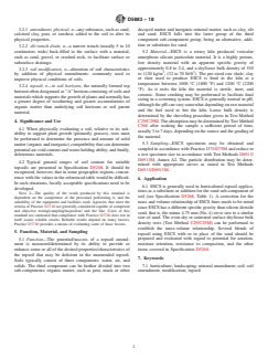 SIGNIFICANCE AND USE 4.1 When physically evaluating a soil, relative to its suitability to support plant growth (primarily grasses), tests must be performed to determine the presence and amount of solid matter (organic and inorganic) compatibility that can determine potential air-void content and water-holding ability, and finally, deleterious materials. 4.2 Typical general ranges of soil content for suitable topsoils are presented in Specification D5268. It should be recognized, however, that in some geographic regions, concurrence with the values in the referenced table would be difficult. In such situations, locally acceptable specifications need to be developed. Note 2: The quality of the result produced by this standard is dependent on the competence of the personnel performing it, and the suitability of the equipment and facilities used. Agencies that meet the criteria of Practice D3740 are generally considered capable of competent and objective testing/sampling/inspection/ and the like. Users of this standard are cautioned that compliance with Practice D3740 does not in itself assure reliable results. Reliable results depend on many factors; Practice D3740 provides a means of evaluating some of those factors. SCOPE 1.1 This guide covers the material characteristics, physical requirements, and sampling appropriate for the designation of the rotary kiln produced expanded shale, clay or slate (ESCS) material as a mineral amendment. 1.2 The presence in the topsoil of the proper nutrient and pH level is necessary for healthy plant growth. This guide does not, however, cover a determination of the nutrients, nor their availability.2 Note 1: The nutrient content of topsoil is important and the chemicals usually evaluated are nitrogen, phosphate, and potassium. Nutrient deficiencies may be corrected by using fertilizers. Excess soluble salts should be examined as to their desirability. The acidity or alkalinity of the soil is also important. Excess acidity may be corrected by the application of lime dust. Excess alkalinity may be corrected by the application of sulfur or other suitable acidifying compounds. The latter item, in addition to lowering pH, also could be considered as an aggregate when considering the particle size distribution. 1.3 Units—The values stated in SI units are to be regarded as standard. The values given in parentheses after SI units are provided for information only and are not considered standard. 1.4 This standard does not purport to address all of the safety concerns, if any, associated with its use. It is the responsibility of the user of this standard to establish appropriate safety, health, and environmental practices and determine the applicability of regulatory limitations prior to use. 1.5 This guide offers an organized collection of information or a series of options and does not recommend a specific course of action. This document cannot replace education or experience and should be used in conjunction with professional judgment. Not all aspects of this guide may be applicable in all circumstances. This ASTM standard is not intended to represent or replace the standard of care by which the adequacy of a given professional service must be judged, nor should this document be applied without consideration of a project's many unique aspects. The word “Standard” in the title of this document means only that the document has been approved through the ASTM consensus process. 1.6 This international standard was developed in accordance with internationally recognized principles on standardization established in the Decision on Principles for the Development of International Standards, Guides and Recommendations issued by the World Trade Organization Technical Barriers to Trade (TBT) Committee.