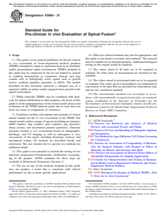 ASTM F2884-21 is the Standard Guide for Pre-clinical in vivo Evaluation of Spinal Fusion, developed by ASTM International. This standard provides comprehensive guidelines for the pre-clinical assessment of tissue-engineered medical products (TEMPs) intended to repair or regenerate bone in the spine. The guide outlines the selection and use of animal models, surgical methods, tissue handling, and various analysis techniques essential for evaluating the efficacy and safety of TEMPs prior to clinical use.