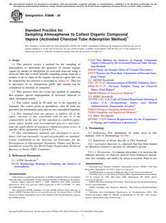 ASTM D3686-20 is a standard published by ASTM International. Its full title is "Standard Practice for Sampling Atmospheres to Collect Organic Compound Vapors (Activated Charcoal Tube Adsorption Method)". This standard covers: SIGNIFICANCE AND USE 5.1 Promulgations by the U.S. Occupational Safety and Health Administration (OSHA) in 29 CFR 1910.1000 designate that certain organic compounds must not be present in workplace atmospheres at concentrations above specific values. 5.2 This practice, when used in conjunction with Test Method D3687, will provide the needed accuracy and precision for the determination of airborne time-weighted average concentrations of many of the organic chemicals including but not limited to CDC-99-74-45, HSM-99-71-31, NIOSH Manual of Analytical Methods, 29 CFR 1910.1000, OSHA Chemical Sampling Information, OSHA Sampling and Analytical Methods, and HSE Methods for the Determination of Hazardous Substances. 5.3 A partial list of chemicals for which this method is applicable is given in Annex A1, along with their OSHA permissible exposure limits. SCOPE 1.1 This practice covers a method for the sampling of atmospheres to determine the presence of certain organic vapors by means of adsorption on activated charcoal using a charcoal tube and a small portable sampling pump worn by a worker. A list of some of the organic chemical vapors that can be sampled by this practice is provided in Annex A1. This list is presented as an information guide and should not be considered as absolute or complete. 1.2 This practice does not cover any method of sampling that requires special impregnation of activated charcoal or other adsorption media. 1.3 The values stated in SI units are to be regarded as standard. The values given in parentheses after SI units are provided for information only and are not considered standard. 1.4 This standard does not purport to address all of the safety concerns, if any, associated with its use. It is the responsibility of the user of this standard to establish appropriate safety, health, and environmental practices and determine the applicability of regulatory limitations prior to use. A specific safety precaution is given in 9.4. 1.5 This international standard was developed in accordance with internationally recognized principles on standardization established in the Decision on Principles for the Development of International Standards, Guides and Recommendations issued by the World Trade Organization Technical Barriers to Trade (TBT) Committee.