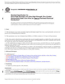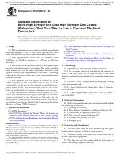 ASTM B957/B957M-23 is a technical specification published by ASTM International. Its full title is "Standard Specification for Extra-High-Strength and Ultra-High-Strength Zinc-Coated (Galvanized) Steel Core Wire for Use in Overhead Electrical Conductors". This standard covers: SCOPE 1.1 This specification covers round, extra-high-strength and ultra-high-strength, Class A zinc-coated (galvanized), steel core wire used for use in Overhead Electrical Conductors. 1.2 This specification covers wire of diameter from 0.0500 in. to 0.1900 in. inclusive or 1.27 mm to 4.82 mm inclusive. 1.3 The values stated in either SI units or inch-pound units are to be regarded separately as standard. The values stated in each system may not be exact equivalents; therefore, each system shall be used independently of the other. Combining values from the two systems may result in non-conformance with the standard. 1.4 This standard does not purport to address all of the safety concerns, if any, associated with its use. It is the responsibility of the user of this standard to establish appropriate safety, health, and environmental practices and determine the applicability of regulatory limitations prior to use. 1.5 This international standard was developed in accordance with internationally recognized principles on standardization established in the Decision on Principles for the Development of International Standards, Guides and Recommendations issued by the World Trade Organization Technical Barriers to Trade (TBT) Committee.