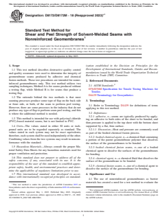 ASTM D8172/D8172M-18(2023)e1 is an international standard developed by ASTM International under the jurisdiction of ASTM Committee D35 on Geosynthetics. This standard details a test method for evaluating the shear and peel strength of solvent-welded, nonreinforced geomembrane seams made by adhesive and chemical fusion processes. As nonreinforced geomembranes are widely used as barrier materials in environmental and civil engineering applications, this standard provides essential procedures for ensuring seam integrity through destructive testing, supporting robust quality control and assurance practices.
