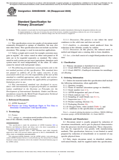 ASTM B494/B494M-08(2020), Standard Specification for Primary Zirconium, specifies requirements for two grades of primary zirconium metal - Grade R60702 and Grade R60703. These grades cover zirconium supplied as sponge or chunklets and can include other physical forms. This specification is limited to non-nuclear applications and does not cover crystal bar zirconium. The document defines the minimum chemical composition, sampling, testing, inspection, marking, and packaging standards for primary zirconium intended for various industrial applications.