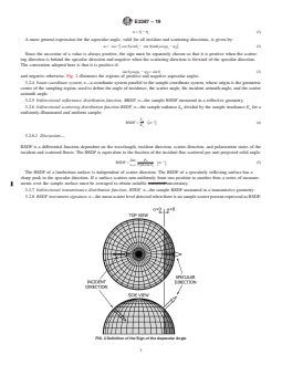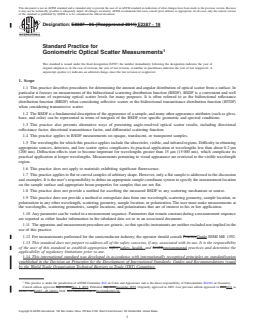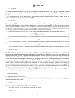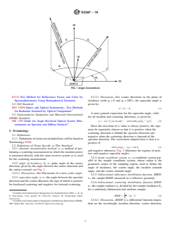 SIGNIFICANCE AND USE 4.1 The angular distribution of scatter is a property of surfaces that may have direct consequences on an intermediate or final application of that surface. Scatter defines many visual appearance attributes of materials, and specification of the distribution and wavelength dependence is critical to the marketability of consumer products, such as automobiles, cosmetics, and electronics. Optically diffusive materials are used in information display applications to spread light from display elements to the viewer, and the performance of such displays relies on specification of the distribution of scatter. Stray-light reduction elements, such as baffles and walls, rely on absorbing coatings that have low diffuse reflectances. Scatter from mirrors, lenses, filters, windows, and other components can limit resolution and contrast in optical systems, such as telescopes, ring laser gyros, and microscopes. 4.2 The microstructure associated with a material affects the angular distribution of scatter, and specific properties can often be inferred from measurements of that scatter. For example, roughness, material inhomogeneity, and particles on smooth surfaces contribute to optical scatter, and optical scatter can be used to detect the presence of such defects. 4.3 The angular distribution of scattered light can be used to simulate or render the appearance of materials. Quality of rendering relies heavily upon accurate measurement of the light scattering properties of the materials being rendered. SCOPE 1.1 This practice describes procedures for determining the amount and angular distribution of optical scatter from a surface. In particular it focuses on measurement of the bidirectional scattering distribution function (BSDF). BSDF is a convenient and well accepted means of expressing optical scatter levels for many purposes. It is often referred to as the bidirectional reflectance distribution function (BRDF) when considering reflective scatter or the bidirectional transmittance distribution function (BTDF) when considering transmissive scatter. 1.2 The BSDF is a fundamental description of the appearance of a sample, and many other appearance attributes (such as gloss, haze, and color) can be represented in terms of integrals of the BSDF over specific geometric and spectral conditions. 1.3 This practice also presents alternative ways of presenting angle-resolved optical scatter results, including directional reflectance factor, directional transmittance factor, and differential scattering function. 1.4 This practice applies to BSDF measurements on opaque, translucent, or transparent samples. 1.5 The wavelengths for which this practice applies include the ultraviolet, visible, and infrared regions. Difficulty in obtaining appropriate sources, detectors, and low scatter optics complicates its practical application at wavelengths less than about 0.2 µm (200 nm). Diffraction effects start to become important for wavelengths greater than 15 µm (15 000 nm), which complicate its practical application at longer wavelengths. Measurements pertaining to visual appearance are restricted to the visible wavelength region. 1.6 This practice does not apply to materials exhibiting significant fluorescence. 1.7 This practice applies to flat or curved samples of arbitrary shape. However, only a flat sample is addressed in the discussion and examples. It is the user’s responsibility to define an appropriate sample coordinate system to specify the measurement location on the sample surface and appropriate beam properties for samples that are not flat. 1.8 This practice does not provide a method for ascribing the measured BSDF to any scattering mechanism or source. 1.9 This practice does not provide a method to extrapolate data from one wavelength, scattering geometry, sample location, or polarization to any other wavelength, scattering geometry, sample location, or polarization. The user must ...