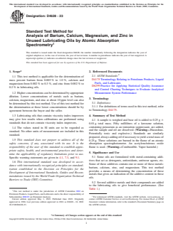 ASTM D4628-23 is a standard published by ASTM International. Its full title is "Standard Test Method for Analysis of Barium, Calcium, Magnesium, and Zinc in Unused Lubricating Oils by Atomic Absorption Spectrometry". This standard covers: SIGNIFICANCE AND USE 5.1 Some oils are formulated with metal-containing additives that act as detergents, antioxidants, antiwear agents, etc. Some of these additives contain one or more of these metals: barium, calcium, zinc, and magnesium. This test method provides a means of determining the concentration of these metals that gives an indication of the additive content in these oils. 5.2 Several additive metals and their compounds are added to the lubricating oils to give beneficial performance. (See Table 1.) SCOPE 1.1 This test method is applicable for the determination of mass percent barium from 0.005 % to 1.0 %, calcium and magnesium from 0.002 % to 0.3 %, and zinc from 0.002 % to 0.2 % in lubricating oils. 1.2 Higher concentrations can be determined by appropriate dilution. Lower concentrations of metals such as barium, calcium, magnesium, and zinc at about 10 ppm level can also be determined by this test method. Use of this test method for the determination at these lower concentrations should be by agreement between the buyer and the seller. 1.3 Lubricating oils that contain viscosity index improvers may give low results when calibrations are performed using standards that do not contain viscosity index improvers. 1.4 The values stated in SI units are to be regarded as standard. No other units of measurement are included in this standard. 1.5 This standard does not purport to address all of the safety concerns, if any, associated with its use. It is the responsibility of the user of this standard to establish appropriate safety, health, and environmental practices and determine the applicability of regulatory limitations prior to use. Specific warning statements are given in 4.1, 7.3, and 9.1. 1.6 This international standard was developed in accordance with internationally recognized principles on standardization established in the Decision on Principles for the Development of International Standards, Guides and Recommendations issued by the World Trade Organization Technical Barriers to Trade (TBT) Committee.