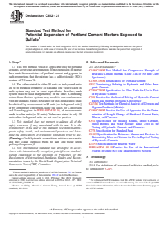ASTM C452-21 is a standard published by ASTM International. Its full title is "Standard Test Method for Potential Expansion of Portland-Cement Mortars Exposed to Sulfate". This standard covers: SIGNIFICANCE AND USE 5.1 This test method is used primarily by those interested in research on methods for determining the potential sulfate resistance of portland cement. This test method is also used to establish that a sulfate-resisting portland cement meets the performance requirements of Specification C150/C150M. SCOPE 1.1 This test method, which is applicable only to portland cements, covers the determination of the expansion of mortar bars made from a mixture of portland cement and gypsum in such proportions that the mixture has a sulfur trioxide (SO3) content of 7.0 mass %. 1.2 The values stated in either SI units or inch-pound units are to be regarded separately as standard. The values stated in each system may not be exact equivalents; therefore, each system shall be used independently of the other. Combining values from the two systems may result in non-conformance with the standard. Values in SI units [or inch-pound units] shall be obtained by measurement in SI units [or inch pound units] or by appropriate conversion, using the Rules for Conversion and Rounding given in IEEE/ASTM SI 10, of measurements made in other units (or SI units). Values are stated in only SI units when inch-pound units are not used in practice. 1.3 This standard does not purport to address all of the safety concerns, if any, associated with its use. It is the responsibility of the user of this standard to establish appropriate safety, health, and environmental practices and determine the applicability of regulatory limitations prior to use. (Warning—Fresh hydraulic cementitious mixtures are caustic and may cause chemical burns to skin and tissue upon prolonged exposure.)2 1.4 This international standard was developed in accordance with internationally recognized principles on standardization established in the Decision on Principles for the Development of International Standards, Guides and Recommendations issued by the World Trade Organization Technical Barriers to Trade (TBT) Committee.