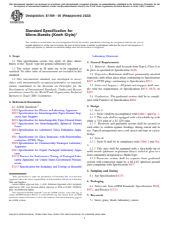ASTM E1189-00(2022) is a technical specification published by ASTM International. Its full title is "Standard Specification for Micro-Burets (Koch Style)". This standard covers: ABSTRACT This specification covers two styles of "Koch" type glass microburets for general laboratory use. Burets shall be made from Type I, Class A or B glass. Both burets shall have permanently attached stopcocks with either glass plugs, or PTFE plugs. Materials shall be tested and the individual grades shall conform to design requirements with the specified values of capacity, scale length, diameter, outflow time, and tolerance. SCOPE 1.1 This specification covers two styles of glass micro-burets of the “Koch” type for general laboratory use. 1.2 The values stated in SI units are to be regarded as standard. No other units of measurement are included in this standard. 1.3 This international standard was developed in accordance with internationally recognized principles on standardization established in the Decision on Principles for the Development of International Standards, Guides and Recommendations issued by the World Trade Organization Technical Barriers to Trade (TBT) Committee.
