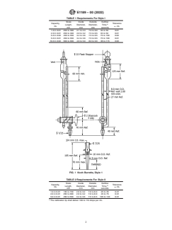 ABSTRACT This specification covers two styles of "Koch" type glass microburets for general laboratory use. Burets shall be made from Type I, Class A or B glass. Both burets shall have permanently attached stopcocks with either glass plugs, or PTFE plugs. Materials shall be tested and the individual grades shall conform to design requirements with the specified values of capacity, scale length, diameter, outflow time, and tolerance. SCOPE 1.1 This specification covers two styles of glass micro-burets of the “Koch” type for general laboratory use. 1.2 The values stated in SI units are to be regarded as standard. No other units of measurement are included in this standard. 1.3 This international standard was developed in accordance with internationally recognized principles on standardization established in the Decision on Principles for the Development of International Standards, Guides and Recommendations issued by the World Trade Organization Technical Barriers to Trade (TBT) Committee.