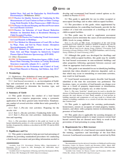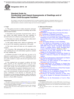 ASTM E2115-22 is a guide published by ASTM International. Its full title is "Standard Guide for Conducting Lead Hazard Assessments of Dwellings and of Other Child-Occupied Facilities". This standard covers: SIGNIFICANCE AND USE 5.1 This guide is intended to help prevent lead poisoning of children by providing standardized procedures for conducting a lead hazard assessment and providing information needed to develop and recommend lead hazard control options as described in Practice E2252. 5.2 This guide is applicable for use in either occupied or unoccupied dwellings and in other child-occupied facilities. 5.3 The procedures in this guide, when supplemented by recommendations for controlling lead hazards, provide for the conduct of a lead risk assessment of a dwelling or of other child-occupied facilities. 5.4 This guide may be used to supplement assessment procedures used to determine the causes of elevated blood lead (EBL) levels in young children. Note 2: In cases of EBL levels, investigation of the total living environment of the child and a pediatric medical evaluation may also be needed. Reference should be made to documents such as Managing Elevated Blood Lead Levels Among Young Children,6 Preventing Lead Poisoning in Young Children (1991),7 the HUD Guidelines, and Screening Young Children for Lead Poisoning (1997).7 5.5 Although this guide was developed for dwellings and for other child-occupied facilities, this guide may be suitable for lead hazard assessments in non-residential buildings and other properties following agreement between assessor and client on appropriate lead action levels. 5.6 This guide is not intended for use in identifying building materials that when abraded or otherwise degraded, such as that which may occur in remodeling or renovation activities, may result in lead hazards. 5.7 Lead hazard assessment reports describe lead hazards identified at the time the assessment was performed. The locations, types, or severities of lead hazards can change over time as a result of property improvement or deterioration, significant changes in property use, or other factors. Note 3: The term “lead-free” should never be used to describe the absence of ... SCOPE 1.1 This guide covers how to conduct, document, and report findings of a lead hazard assessment of dwellings and of other child-occupied facilities. 1.2 Procedures for assessment of personal items, such as toys, dishes, and hobby materials that may contribute to elevated lead levels in blood are not included in this guide. 1.3 Procedures for random sampling of units within dwellings having multiple units are not included. 1.4 This guide contains notes, which are explanatory, and are not part of the mandatory requirements of this guide. 1.5 The values stated in SI units are to be regarded as the standard. 1.5.1 Exception—The inch-pound and SI units shown for wipe sampling data are to be individually regarded as standard for wipe sampling data. 1.6 Methods described in this guide may not meet or be allowed by requirements or regulations established by local authorities having jurisdiction. It is the responsibility of the user of this standard to comply with all such requirements and regulations. 1.7 This standard does not purport to address all of the safety concerns, if any, associated with its use. It is the responsibility of the user of this standard to establish appropriate safety, health, and environmental practices and determine the applicability of regulatory limitations prior to use. 1.8 This international standard was developed in accordance with internationally recognized principles on standardization established in the Decision on Principles for the Development of International Standards, Guides and Recommendations issued by the World Trade Organization Technical Barriers to Trade (TBT) Committee.