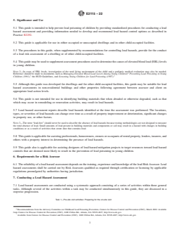 SIGNIFICANCE AND USE 5.1 This guide is intended to help prevent lead poisoning of children by providing standardized procedures for conducting a lead hazard assessment and providing information needed to develop and recommend lead hazard control options as described in Practice E2252. 5.2 This guide is applicable for use in either occupied or unoccupied dwellings and in other child-occupied facilities. 5.3 The procedures in this guide, when supplemented by recommendations for controlling lead hazards, provide for the conduct of a lead risk assessment of a dwelling or of other child-occupied facilities. 5.4 This guide may be used to supplement assessment procedures used to determine the causes of elevated blood lead (EBL) levels in young children. Note 2: In cases of EBL levels, investigation of the total living environment of the child and a pediatric medical evaluation may also be needed. Reference should be made to documents such as Managing Elevated Blood Lead Levels Among Young Children,6 Preventing Lead Poisoning in Young Children (1991),7 the HUD Guidelines, and Screening Young Children for Lead Poisoning (1997).7 5.5 Although this guide was developed for dwellings and for other child-occupied facilities, this guide may be suitable for lead hazard assessments in non-residential buildings and other properties following agreement between assessor and client on appropriate lead action levels. 5.6 This guide is not intended for use in identifying building materials that when abraded or otherwise degraded, such as that which may occur in remodeling or renovation activities, may result in lead hazards. 5.7 Lead hazard assessment reports describe lead hazards identified at the time the assessment was performed. The locations, types, or severities of lead hazards can change over time as a result of property improvement or deterioration, significant changes in property use, or other factors. Note 3: The term “lead-free” should never be used to describe the absence of ... SCOPE 1.1 This guide covers how to conduct, document, and report findings of a lead hazard assessment of dwellings and of other child-occupied facilities. 1.2 Procedures for assessment of personal items, such as toys, dishes, and hobby materials that may contribute to elevated lead levels in blood are not included in this guide. 1.3 Procedures for random sampling of units within dwellings having multiple units are not included. 1.4 This guide contains notes, which are explanatory, and are not part of the mandatory requirements of this guide. 1.5 The values stated in SI units are to be regarded as the standard. 1.5.1 Exception—The inch-pound and SI units shown for wipe sampling data are to be individually regarded as standard for wipe sampling data. 1.6 Methods described in this guide may not meet or be allowed by requirements or regulations established by local authorities having jurisdiction. It is the responsibility of the user of this standard to comply with all such requirements and regulations. 1.7 This standard does not purport to address all of the safety concerns, if any, associated with its use. It is the responsibility of the user of this standard to establish appropriate safety, health, and environmental practices and determine the applicability of regulatory limitations prior to use. 1.8 This international standard was developed in accordance with internationally recognized principles on standardization established in the Decision on Principles for the Development of International Standards, Guides and Recommendations issued by the World Trade Organization Technical Barriers to Trade (TBT) Committee.