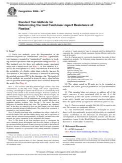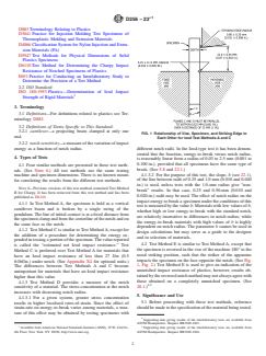 SIGNIFICANCE AND USE 5.1 Before proceeding with these test methods, reference should be made to the specification of the material being tested. Any test specimen preparation, conditioning, dimensions, and testing parameters covered in the materials specification shall take precedence over those mentioned in these test methods. If there is no material specification, then the default conditions apply. 5.2 The pendulum impact test indicates the energy to break standard test specimens of specified size under stipulated parameters of specimen mounting, notching, and pendulum velocity-at-impact. 5.3 The energy lost by the pendulum during the breakage of the specimen is the sum of the following: 5.3.1 Energy to initiate fracture of the specimen; 5.3.2 Energy to propagate the fracture across the specimen; 5.3.3 Energy to throw the free end (or ends) of the broken specimen (“toss correction”); 5.3.4 Energy to bend the specimen; 5.3.5 Energy to produce vibration in the pendulum arm; 5.3.6 Energy to produce vibration or horizontal movement of the machine frame or base; 5.3.7 Energy to overcome friction in the pendulum bearing and in the indicating mechanism, and to overcome windage (pendulum air drag); 5.3.8 Energy to indent or deform plastically the specimen at the line of impact; and 5.3.9 Energy to overcome the friction caused by the rubbing of the striker (or other part of the pendulum) over the face of the bent specimen. 5.4 For relatively brittle materials, for which fracture propagation energy is small in comparison with the fracture initiation energy, the indicated impact energy absorbed is, for all practical purposes, the sum of factors 5.3.1 and 5.3.3. The toss correction (see 5.3.3) may represent a very large fraction of the total energy absorbed when testing relatively dense and brittle materials. Test Method C shall be used for materials that have an Izod impact resistance of less than 27 J/m (0.5 ft·lbf/in.). (See Appendix X4 for optional units.) T... SCOPE 1.1 These test methods cover the determination of the resistance of plastics to “standardized” (see Note 1) pendulum-type hammers, mounted in “standardized” machines, in breaking standard specimens with one pendulum swing (see Note 2). The standard tests for these test methods require specimens made with a milled notch (see Note 3). In Test Methods A, C, and D, the notch produces a stress concentration that increases the probability of a brittle, rather than a ductile, fracture. In Test Method E, the impact resistance is obtained by reversing the notched specimen 180° in the clamping vise. The results of all test methods are reported in terms of energy absorbed per unit of specimen width or per unit of cross-sectional area under the notch. (See Note 4.) Note 1: The machines with their pendulum-type hammers have been “standardized” in that they must comply with certain requirements, including a fixed height of hammer fall that results in a substantially fixed velocity of the hammer at the moment of impact. However, hammers of different initial energies (produced by varying their effective weights) are recommended for use with specimens of different impact resistance. Moreover, manufacturers of the equipment are permitted to use different lengths and constructions of pendulums with possible differences in pendulum rigidities resulting. (See Section 5.) Be aware that other differences in machine design may exist. The specimens are “standardized” in that they are required to have one fixed length, one fixed depth, and one particular design of milled notch. The width of the specimens is permitted to vary between limits. Note 2: Results generated using pendulums that utilize a load cell to record the impact force and thus impact energy, may not be equivalent to results that are generated using manually or digitally encoded testers that measure the energy remaining in the pendulum after impact. Note 3: The notch in the Iz...