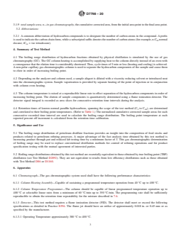 SIGNIFICANCE AND USE 5.1 The boiling range distribution of petroleum distillate fractions provides an insight into the composition of feed stocks and products related to petroleum refining processes. A major advantage of the fast analysis time obtained by this test method is increasing product through put and reduced lab testing time by a minimum factor of 3. This gas chromatographic determination of boiling range may be used to replace conventional distillation methods for control of refining operations and for product specification testing with the mutual agreement of interested parties. 5.2 Boiling range distributions obtained by this test method are essentially equivalent to those obtained by true boiling point (TBP) distillation (see Test Method D2892). They are not equivalent to results from low efficiency distillations such as those obtained with Test Method D86 or D1160. SCOPE 1.1 This test method covers the determination of the boiling range distribution of petroleum products and biodiesel formulations, B5, B10, and B20. It is applicable to petroleum distillates having a final boiling point not greater than 538 °C or lower at atmospheric pressure as measured by this test method. The difference between the initial boiling point and the final boiling point shall be greater than 55 °C. 1.2 The test method is not applicable for analysis of petroleum distillates containing low molecular weight components (for example naphthas, reformates, gasolines, full range crude oils). Materials containing heterogeneous mixtures (for example, alcohols, ethers, acids or esters, except biodiesels) or residue are not to be analyzed by this test method. See Test Methods D3710, D7096, D6352, or D7169. 1.3 This test method uses the principles of simulated distillation methodology. This test method uses gas chromatographic components that allow the entire analysis from sample to sample to occur in 5 min or less. In these instruments the column is heated directly at rates 10 to 15 times that of a conventional gas chromatograph and thus the analysis time is reduced from sample to sample. 1.4 The values stated in SI units are to be regarded as standard. No other units of measurement are included in this standard. 1.4.1 Exception—Appendix X1 includes temperatures in Fahrenheit for information only. 1.5 This standard does not purport to address all of the safety concerns, if any, associated with its use. It is the responsibility of the user of this standard to establish appropriate safety, health, and environmental practices and determine the applicability of regulatory limitations prior to use. 1.6 This international standard was developed in accordance with internationally recognized principles on standardization established in the Decision on Principles for the Development of International Standards, Guides and Recommendations issued by the World Trade Organization Technical Barriers to Trade (TBT) Committee.
