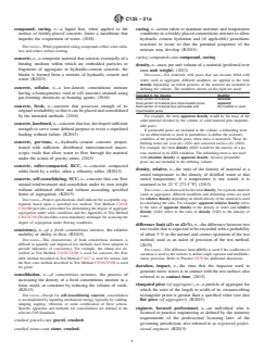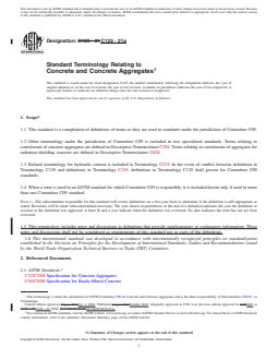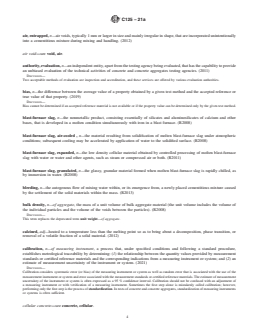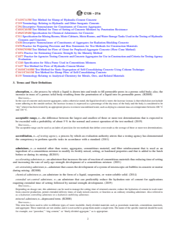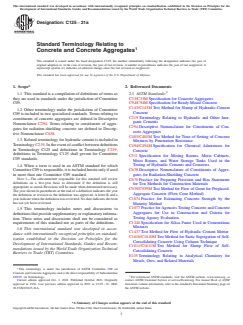 SCOPE 1.1 This standard is a compilation of definitions of terms as they are used in standards under the jurisdiction of Committee C09. 1.2 Other terminology under the jurisdiction of Committee C09 is included in two specialized standards. Terms relating to constituents of concrete aggregates are defined in Descriptive Nomenclature C294. Terms relating to constituents of aggregates for radiation-shielding concrete are defined in Descriptive Nomenclature C638. 1.3 Related terminology for hydraulic cement is included in Terminology C219. In the event of conflict between definitions in Terminology C125 and definitions in Terminology C219, definitions in Terminology C125 shall govern for Committee C09 standards. 1.4 When a term is used in an ASTM standard for which Committee C09 is responsible, it is included herein only if used in more than one Committee C09 standard. Note 1: The subcommittee responsible for this standard will review definitions on a five-year basis to determine if the definition is still appropriate as stated. Revisions will be made when determined necessary. The year shown in parentheses at the end of a definition indicates the year the definition or revision to the definition was approved. A letter R and a year indicate when the definition was reviewed. No date indicates the term has not yet been reviewed. 1.5 This terminology includes notes and discussions to definitions that provide supplementary or explanatory information. These notes and discussions shall not be considered as requirements of this standard nor as parts of the definitions. 1.6 This international standard was developed in accordance with internationally recognized principles on standardization established in the Decision on Principles for the Development of International Standards, Guides and Recommendations issued by the World Trade Organization Technical Barriers to Trade (TBT) Committee.