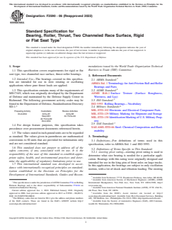 ASTM F2590-06(2022) is a technical specification published by ASTM International. Its full title is "Standard Specification for Bearing, Roller, Thrust, Two Channeled Race Surface, Rigid or Flat Seat Type". This standard covers: ABSTRACT This specification covers requirements for rigid or flat seat type, two channeled race surface, thrust roller bearings intended for use in slow rotating or oscillating applications where pure thrust loads are applied. The thrust bearing shall be made of the specified high carbon chromium alloy steel. Requirements for (1) physical properties such as heat treatment, (2) dimensions and mass, and (3) surface finish are specified. Dimensions of retainer type, steering gear service and retainerless type, intermittent operation, are illustrated. SCOPE 1.1 This specification covers requirements for rigid or flat seat type, two channeled race surface, thrust roller bearings. 1.2 Intended Use—The bearings covered in this specification are intended for use in slow rotating or oscillating applications where pure thrust loads are applied. 1.3 This specification contains many of the requirements of MS17169, which was originally developed by the Department of Defense and maintained by the Defense Supply Center in Richmond. The following government activity codes may be found in the Department of Defense, Standardization Directory SD-1.2 Preparing Activity Custodians Review Activities DLA-GS4 Army-AT Army-MI Navy-MC Air Force-84 Air Force-99 DLA-GS4 1.4 For design feature purposes, this specification takes precedence over procurement documents referenced herein. 1.5 The values stated in inch-pound units are to be regarded as standard. The values given in parentheses are mathematical conversions to SI units that are provided for information only and are not considered standard. 1.6 This standard does not purport to address all of the safety concerns, if any, associated with its use. It is the responsibility of the user of this standard to establish appropriate safety, health, and environmental practices and determine the applicability of regulatory limitations prior to use. 1.7 This international standard was developed in accordance with internationally recognized principles on standardization established in the Decision on Principles for the Development of International Standards, Guides and Recommendations issued by the World Trade Organization Technical Barriers to Trade (TBT) Committee.