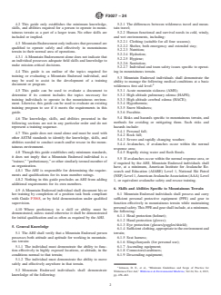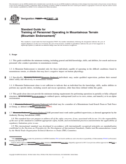 SIGNIFICANCE AND USE 4.1 This guide establishes a minimum standard for training of SAR personnel who conduct operations in mountainous terrain. 4.1.1 Mountain Endorsed individuals are required to have, at a minimum, the knowledge, skills, and abilities pertaining to safe movement individually, or as a member of a team, in mountainous terrain. 4.1.2 Every person who is identified as Mountain Endorsed shall meet the requirements of this guide. 4.1.3 Mountain Endorsed individuals shall be entitled to add the prefix “Mountain Endorsed” to their current training levels. 4.2 This guide only establishes the minimum knowledge, skills, and abilities required for a person to operate in mountainous terrain as a part of a larger team. No other skills are included or implied. 4.3 Mountain Endorsement only indicates that personnel are qualified to operate safely and effectively in mountainous terrain in their normal area of operations. 4.3.1 A Mountain Endorsement alone does not indicate that an individual possesses adequate field skills and knowledge to make mission-critical decisions. 4.4 This guide is an outline of the topics required for training or evaluating a Mountain Endorsed individual, and may be used to assist in the development of a training document or program. 4.5 This guide can be used to evaluate a document to determine if its content includes the topics necessary for training individuals to operate in the mountainous environment. Likewise, this guide can be used to evaluate an existing training program to see if it meets the requirements in this guide. 4.6 The knowledge, skills, and abilities presented in the following sections are not in any particular order and do not represent a training sequence. 4.7 This guide does not stand alone and must be used with other ASTM standards to identify the knowledge, skills, and abilities needed to conduct search and/or rescue in the mountainous environment. 4.8 Though this guide establishes only minimum standards... SCOPE 1.1 This guide establishes the minimum training, including general and field knowledge, skills, and abilities, for search and rescue personnel who conduct operations in mountainous terrain. 1.2 A Mountain Endorsement is intended only for those individuals capable of operating in the difficult conditions found in mountainous terrain, at altitudes that may have a negative impact on human physiology. 1.3 Specifically, Mountain Endorsed individuals may, under qualified supervision, perform their normal duties safely and effectively in mountainous terrain. 1.4 A Mountain Endorsement alone is not sufficient to indicate that an individual has the knowledge, skills, and/or abilities to perform any specific duties, including search and rescue operations, other than those defined within this guide. 1.5 This guide alone does not provide the minimum training requirements for performing operations in partially or fully collapsed structures, in or on water, in confined spaces, underground (such as in caves, mines, and tunnels), or in an alpine environment. 1.6 A Mountain Endorsed individual may be a member of a Mountainous Land Search Team or Task Force or Group, as defined in Classification F1993. 1.7 Mountain Endorsed SAR personnel must work under qualified supervision, as deemed appropriate by the Authority Having Jurisdiction (AHJ). 1.8 This standard does not purport to address all of the safety concerns, if any, associated with its use. It is the responsibility of the user of this standard to establish appropriate safety, health, and environmental practices and determine the applicability of regulatory limitations prior to use. 1.9 This international standard was developed in accordance with internationally recognized principles on standardization established in the Decision on Principles for the Development of International Standards, Guides and Recommendations issued by the World Trade Organization Techn...