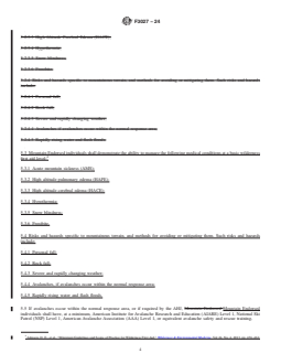 ASTM F3027-24 is a guide published by ASTM International. Its full title is "Standard Guide for Training of Personnel Operating in Mountainous Terrain (Mountain Endorsement)". This standard covers: SIGNIFICANCE AND USE 4.1 This guide establishes a minimum standard for training of SAR personnel who conduct operations in mountainous terrain. 4.1.1 Mountain Endorsed individuals are required to have, at a minimum, the knowledge, skills, and abilities pertaining to safe movement individually, or as a member of a team, in mountainous terrain. 4.1.2 Every person who is identified as Mountain Endorsed shall meet the requirements of this guide. 4.1.3 Mountain Endorsed individuals shall be entitled to add the prefix “Mountain Endorsed” to their current training levels. 4.2 This guide only establishes the minimum knowledge, skills, and abilities required for a person to operate in mountainous terrain as a part of a larger team. No other skills are included or implied. 4.3 Mountain Endorsement only indicates that personnel are qualified to operate safely and effectively in mountainous terrain in their normal area of operations. 4.3.1 A Mountain Endorsement alone does not indicate that an individual possesses adequate field skills and knowledge to make mission-critical decisions. 4.4 This guide is an outline of the topics required for training or evaluating a Mountain Endorsed individual, and may be used to assist in the development of a training document or program. 4.5 This guide can be used to evaluate a document to determine if its content includes the topics necessary for training individuals to operate in the mountainous environment. Likewise, this guide can be used to evaluate an existing training program to see if it meets the requirements in this guide. 4.6 The knowledge, skills, and abilities presented in the following sections are not in any particular order and do not represent a training sequence. 4.7 This guide does not stand alone and must be used with other ASTM standards to identify the knowledge, skills, and abilities needed to conduct search and/or rescue in the mountainous environment. 4.8 Though this guide establishes only minimum standards... SCOPE 1.1 This guide establishes the minimum training, including general and field knowledge, skills, and abilities, for search and rescue personnel who conduct operations in mountainous terrain. 1.2 A Mountain Endorsement is intended only for those individuals capable of operating in the difficult conditions found in mountainous terrain, at altitudes that may have a negative impact on human physiology. 1.3 Specifically, Mountain Endorsed individuals may, under qualified supervision, perform their normal duties safely and effectively in mountainous terrain. 1.4 A Mountain Endorsement alone is not sufficient to indicate that an individual has the knowledge, skills, and/or abilities to perform any specific duties, including search and rescue operations, other than those defined within this guide. 1.5 This guide alone does not provide the minimum training requirements for performing operations in partially or fully collapsed structures, in or on water, in confined spaces, underground (such as in caves, mines, and tunnels), or in an alpine environment. 1.6 A Mountain Endorsed individual may be a member of a Mountainous Land Search Team or Task Force or Group, as defined in Classification F1993. 1.7 Mountain Endorsed SAR personnel must work under qualified supervision, as deemed appropriate by the Authority Having Jurisdiction (AHJ). 1.8 This standard does not purport to address all of the safety concerns, if any, associated with its use. It is the responsibility of the user of this standard to establish appropriate safety, health, and environmental practices and determine the applicability of regulatory limitations prior to use. 1.9 This international standard was developed in accordance with internationally recognized principles on standardization established in the Decision on Principles for the Development of International Standards, Guides and Recommendations issued by the World Trade Organization Techn...