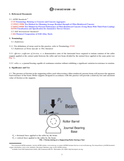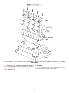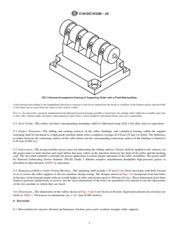 SIGNIFICANCE AND USE 4.1 The presence of friction in the supporting rollers used when testing a fiber-reinforced concrete beam will increase the apparent load resistance of the beam. Roller supports designed in accordance with this practice will provide a relatively low and consistent value of friction at the supports. 4.2 Two types of rollers are used to support a beam. One includes a cylindrical bearing that allows the roller assembly to rotate along an axis parallel to the longitudinal axis of the beam and thereby accommodate any warping introduced during specimen fabrication. The other roller does not include the cylindrical bearing. 4.3 The rollers are designed for use with 150 mm [6 in.] or 100 mm [4 in.] deep beams of square cross-section. 4.4 A method is provided for correcting the apparent load resistance measured using the roller with a known value of the effective coefficient of friction of the roller supports to obtain an estimate of the load resistance in the absence of friction. SCOPE 1.1 This practice prescribes the design of journal-bearing type rollers to support each end of fiber-reinforced concrete beams tested using Test Method C1399/C1399M or Test Method C1609/C1609M. The roller design is intended to provide a consistent and relatively low value of effective coefficient of friction at the beam supports. The bearing design incorporates metal-on-metal sliding surfaces lubricated with grease. Note 1: During the progress of a test, a crack or cracks open on the underside of the beam between the loaded third points causing the underside of each portion of the beam to move away from the center. The design is intended to provide for unlimited rotation of the roller at the point of contact with the test beam in response to this motion. Note 2: The design of the supporting rollers is a significant factor in determining the magnitude of the arching forces that cause error in flexural test results.2 Improperly designed supporting rollers can influence the apparent flexural behavior of fiber-reinforced concrete beams.3 The effective coefficient of friction can be determined using a method similar to that described by Bernard.4 1.2 The text of this standard refers to notes and footnotes that provide explanatory material. These notes and footnotes (excluding those in tables and figures) shall not be considered as requirements of the standard. 1.3 Units—The values stated in either SI units or inch-pound units are to be regarded separately as standard. The values stated in each system are not necessarily exact equivalents; therefore, to ensure conformance with the standard, each system shall be used independently of the other, and values from the two systems shall not be combined. 1.4 This standard does not purport to address all of the safety concerns, if any, associated with its use. It is the responsibility of the user of this standard to establish appropriate safety, health, and environmental practices and determine the applicability of regulatory limitations prior to use. 1.5 This international standard was developed in accordance with internationally recognized principles on standardization established in the Decision on Principles for the Development of International Standards, Guides and Recommendations issued by the World Trade Organization Technical Barriers to Trade (TBT) Committee.