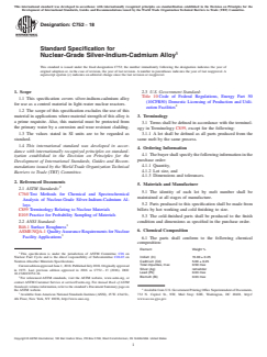 ASTM C752-18 is a technical specification published by ASTM International. Its full title is "Standard Specification for Nuclear-Grade Silver-Indium-Cadmium Alloy". This standard covers: ABSTRACT This specification covers silver-indium-cadmium alloy for use as a control material in light-water nuclear reactors. The use of this material in applications is excluded where material strength of this alloy is a prime requisite. Also, this material must be protected from the primary water by a corrosion and wear resistant cladding. The identity of each lot by melt number shall be maintained at all stages of manufacture. Parts produced to this specification shall be made from billets by hot working and cold finishing to size. The cold-finished parts shall be produced to the finish condition and dimensions as specified. The surface of the cold-finished part shall be free of oxides, grease, oil, residual lubricants, inclusions, and other extraneous materials. Surface defects such as folds, cracks, seams, slivers, and blisters shall be cause for rejection. SCOPE 1.1 This specification covers silver-indium-cadmium alloy for use as a control material in light-water nuclear reactors. 1.2 The scope of this specification excludes the use of this material in applications where material strength of this alloy is a prime requisite. Also, this material must be protected from the primary water by a corrosion and wear resistant cladding. 1.3 The values stated in SI units are to be regarded as standard. 1.4 This international standard was developed in accordance with internationally recognized principles on standardization established in the Decision on Principles for the Development of International Standards, Guides and Recommendations issued by the World Trade Organization Technical Barriers to Trade (TBT) Committee.