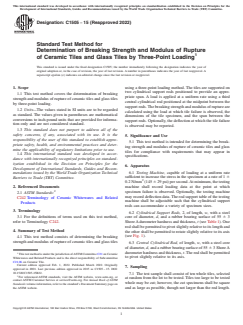- Test Scope: Specifies procedures for determining both breaking strength and modulus of rupture of ceramic and glass tiles using a three-point flexural loading setup.