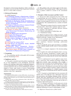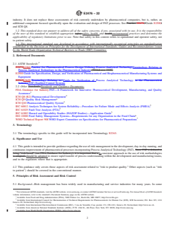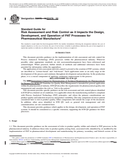 SIGNIFICANCE AND USE 4.1 This guide is intended to provide guidance regarding the use of risk management in the development, day-to-day running, and continuous improvement of pharmaceutical processes incorporating Process Analytical Technology (PAT). A consistent approach to the use of risk methodologies should be adopted to ensure rapid transfer of process understanding within the development and manufacturing teams, and to the regulators where that is appropriate. 4.2 This guidance only covers those aspects of risk assessment related to “risk to product quality.” Other aspects (such as “risk to patient”) should be covered in the conventional manner. SCOPE 1.1 This document provides guidance on the assessment of risks to product quality within and related to PAT processes in the pharmaceutical industry. It addresses those risks to product quality arising from, associated with, identified by, or modified by the implementation of PAT in pharmaceutical development and manufacturing for primary, secondary, and biotech sectors of the industry. It does not replace those assessments of risk currently undertaken by pharmaceutical companies, but is, rather, an additional component focused specifically upon the evaluation and design of PAT processes. See Guide E2500 and ICH Q8. 1.2 This standard does not purport to address all of the safety concerns, if any, associated with its use. It is the responsibility of the user of this standard to establish appropriate safety, health, and environmental practices and determine the applicability of regulatory limitations prior to use. Note that safety in this context refers to operational and operator safety, not to patient safety. 1.3 This international standard was developed in accordance with internationally recognized principles on standardization established in the Decision on Principles for the Development of International Standards, Guides and Recommendations issued by the World Trade Organization Technical Barriers to Trade (TBT) Committee.