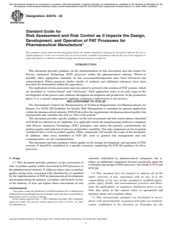 ASTM E2476-22 is a standard guide developed by ASTM for risk assessment and risk control as they impact the design, development, and operation of Process Analytical Technology (PAT) processes in pharmaceutical manufacturing. This guide provides structured guidance for evaluating and controlling risks specifically related to product quality in PAT-enabled pharmaceutical processes, applicable across primary, secondary, and biotechnology sectors. The standard supports the implementation of risk management strategies throughout the lifecycle of pharmaceutical development and manufacturing, facilitating improved process understanding, regulatory compliance, and product consistency.