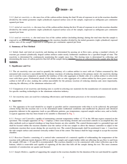 SIGNIFICANCE AND USE 5.1 The air reactivity rates are used to quantify the tendency of a carbon artifact to react with air. Carbon consumed by this unwanted side reaction is unavailable for the primary reactions of reducing alumina to the primary metal. Air reactivity dusting rate is used by some companies to quantify the tendency of the coke aggregate or binder coke of a carbon artifact to selectively react with these gases. Preferential attack of the binder coke or coke aggregate of a carbon artifact by these gases causes some carbon to fall off or dust, making the carbon unavailable for the primary reaction of reducing alumina and, more importantly, reducing the efficiency of the aluminum reduction cell. 5.2 Comparison of air reactivity and dusting rates is useful in selecting raw materials for the manufacture of commercial anodes for specific smelting technologies in the aluminum reduction industry. 5.3 Air reactivity rates are used for evaluating effectiveness and beneficiation processes or for research purposes. SCOPE 1.1 This test method covers the thermogravimetric (TGA) determination of air reactivity and dusting of shaped carbon anodes and cathode blocks used in the aluminum reduction industry. The apparatus selection covers a significant variety of types with various thermal conditions, sample size capability, materials of construction, and procedures for determining the mass loss and subsequent rate of reaction. This test method standardizes the variables of sample shape, reaction temperature, gas velocity over the exposed surfaces, and reaction time such that results obtained on different apparatuses are correlatable. 1.2 The values stated in SI units are to be regarded as standard. No other units of measurement are included in this standard. 1.3 This standard does not purport to address all of the safety concerns, if any, associated with its use. It is the responsibility of the user of this standard to establish appropriate safety, health, and environmental practices and determine the applicability of regulatory limitations prior to use. 1.4 This international standard was developed in accordance with internationally recognized principles on standardization established in the Decision on Principles for the Development of International Standards, Guides and Recommendations issued by the World Trade Organization Technical Barriers to Trade (TBT) Committee.