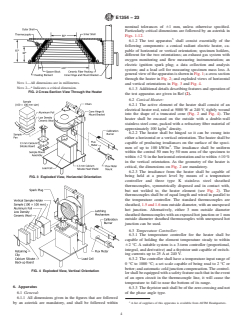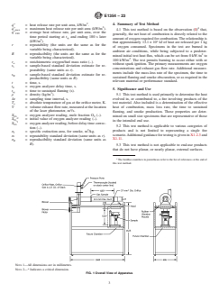 SIGNIFICANCE AND USE 5.1 This test method is used primarily to determine the heat evolved in, or contributed to, a fire involving products of the test material. Also included is a determination of the effective heat of combustion, mass loss rate, the time to sustained flaming, and smoke production. These properties are determined on small size specimens that are representative of those in the intended end use. 5.2 This test method is applicable to various categories of products and is not limited to representing a single fire scenario. Additional guidance for testing is given in X1.2.3 and X1.11. 5.3 This test method is not applicable to end-use products that do not have planar, or nearly planar, external surfaces. FIG. 1 Overall View of Apparatus Note 1: All dimensions are in millimetres. Note 2: * Indicates a critical dimension. FIG. 2 Cross-Section View Through the Heater Note 1: All dimensions are in millimetres. Note 2: * Indicates a critical dimension. FIG. 3 Exploded View, Horizontal Orientation FIG. 4 Exploded View, Vertical Orientation FIG. 5 Exhaust System Note 1: All dimensions are in millimetres (not to scale). FIG. 6 Horizontal Specimen Holder Note 1: All dimensions are in millimetres. Note 2: * Indicates a critical dimension. FIG. 7 Vertical Specimen Holder Note 1: All dimensions are in millimetres except where noted. Note 2: * Indicates a critical dimension. FIG. 8 Optional Wire Grid (For Horizontal or Vertical Orientation) Note 1: All dimensions are in millimetres. FIG. 9 Gas Analyzer Instrumentation Note 1: Rotameter is on outlet of the oxygen (O2) analyzer. FIG. 10 Smoke Obscuration Measuring System FIG. 11 Calibration Burner Note 1: All dimensions are in millimetres except where noted. FIG. 12 Optional Retainer Frame for Horizontal Orientation Testing Note 1: All dimensions are in millimetres. Note 2: * Indicates a critical dimension. SCOPE 1.1 This fire-test-response standard provides for measuring the response of materials exposed to controlled levels of radiant heating with or without an external ignitor. 1.2 This test method is used to determine the ignitability, heat release rates, mass loss rates, effective heat of combustion, and visible smoke development of materials and products. 1.3 The rate of heat release is determined by measurement of the oxygen consumption as determined by the oxygen concentration and the flow rate in the exhaust product stream. The effective heat of combustion is determined from a concomitant measurement of specimen mass loss rate, in combination with the heat release rate. Smoke development is measured by obscuration of light by the combustion product stream. 1.4 Specimens shall be exposed to initial test heat fluxes in the range of 0 kW/m2 to 100 kW/m2. External ignition, when used, shall be by electric spark. The value of the initial test heat flux and the use of external ignition are to be as specified in the relevant material or performance standard (see X1.2). The normal specimen testing orientation is horizontal, independent of whether the end-use application involves a horizontal or a vertical orientation. The apparatus also contains provisions for vertical orientation testing; this is used for exploratory or diagnostic studies only. 1.5 Ignitability is determined as a measurement of time from initial exposure to time of sustained flaming. 1.6 This test method has been developed for use for material and product evaluations, mathematical modeling, design purposes, or development and research. Examples of material specimens include portions of an end-use product or the various components used in the end-use product. 1.7 Units—The values stated in SI units are to be regarded as standard. No other units of measurement are included in this standard. 1.8 This standard is used to measure and describe the response of materials, products, or assemblies to heat and flame un...