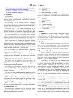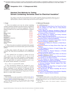 ASTM D115-17(2024), titled Standard Test Methods for Testing Solvent Containing Varnishes Used for Electrical Insulation, establishes comprehensive testing methods for varnishes primarily intended to provide electrical, mechanical, and chemical protection to electrical equipment. Published by ASTM, this standard is widely recognized in the electrical insulation industry and outlines procedures for assessing both the quality control and performance of solvent-containing varnishes. It is essential for manufacturers, quality control laboratories, and users focused on ensuring consistent batch quality, operational reliability, and compliance with safety and regulatory requirements.