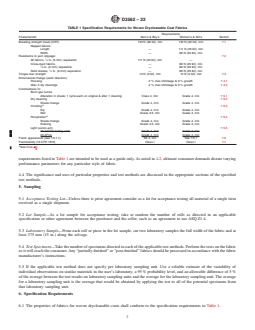 - Testing Methods: Relies on referenced ASTM and AATCC test methods to assess performance attributes and prescribes sampling procedures for quality verification.