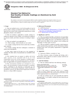 SIGNIFICANCE AND USE 3.1 This test method describes a destructive test procedure for measuring the degree of seal of the porosity in anodic oxide coatings. Low coating mass loss is an indication of good seal quality and of the ability of the coating to resist staining and “blooming” in many types of service. 3.2 This test method is suitable for quality control purposes within manufacturing operations and for determining whether anodized parts meet seal quality requirements in applicable specifications. SCOPE 1.1 This test method covers a test for the quality of seal of porous anodic coatings on aluminum and its alloys. It is based upon the loss in mass of the coating after immersion in a warm phosphoric-chromic acid solution. 1.2 This test method is applicable to anodic coatings intended for exposure to the weather, or for protective purposes in corrosive media, and where resistance to staining is important. 1.3 This test method is not applicable to: 1.3.1 Hard coatings, which normally are not sealed. 1.3.2 Anodic coatings that have been sealed only in dichromate solutions. 1.3.3 Anodic coatings that have undergone a treatment to render them hydrophobic. 1.4 The values stated in SI units are to be regarded as standard. No other units of measurement are included in this standard. 1.5 This standard does not purport to address all of the safety concerns, if any, associated with its use. It is the responsibility of the user of this standard to establish appropriate safety, health, and environmental practices and determine the applicability of regulatory limitations prior to use. 1.6 This international standard was developed in accordance with internationally recognized principles on standardization established in the Decision on Principles for the Development of International Standards, Guides and Recommendations issued by the World Trade Organization Technical Barriers to Trade (TBT) Committee.
