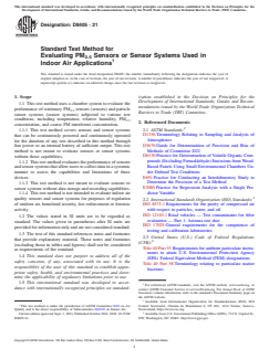 ASTM D8405-21 is a standard published by ASTM International. Its full title is "Standard Test Method for Evaluating PM<inf>2.5</inf> Sensors or Sensor Systems Used in Indoor Air Applications". This standard covers: SIGNIFICANCE AND USE 5.1 Poor indoor air quality has been implicated in significant adverse acute and chronic impacts on occupant health and performance. The ability to assess the components contributing to poor indoor air quality is critical for determining best practices for improving indoor air quality. 5.2 Measurement of pollutants in indoor environments using sensors and sensor systems provides information needed to improve indoor air quality through pollutant source control, ventilation, filtration or other treatments. 5.3 This method uses a test characterization chamber system equipped with reference monitor(s) to evaluate the response of test sensors or test sensor systems to specific types of particles (for example, salt, polystyrene latex, or dust). To facilitate reproducible results, the test particles used within this method are standardized and have known properties. The user is cautioned that a single particle type is not representative of all particles found indoors. The relative response of test sensors or test sensor systems to a reference monitor can vary by a factor of two for different particle types (for example, primary or secondary, organic or inorganic, outdoor or indoor origin; see 6.11.3 for further discussion). Furthermore, the user is cautioned that the lower limit of particle size detection for optical test sensors and test sensor systems is generally 0.3 μm in diameter; particles below this size are generally undetected and may represent a significant health concern as well. SCOPE 1.1 This test method uses a chamber system to evaluate the performance of stationary PM2.5 sensors (sensors) and particle sensor systems (sensor systems) subjected to various test conditions, including temperature, relative humidity, PM2.5 concentration, and coarse PM interferent concentration. 1.1.1 This test method covers sensors and sensor systems that can be continuously powered and continuously operated for the duration of any test described in this method through line power or an internal battery of sufficient output. This test method is not meant to evaluate sensors or sensor systems without these capabilities. 1.1.2 This test method evaluates the performance of sensors and sensor systems that allow users to collect data in a systemic manner to assess the capabilities and limitations of these devices. 1.1.3 This test method is not meant to evaluate sensors or sensor systems without data storage and recording capabilities. 1.1.4 This test method is not intended to evaluate indoor air quality sensors and sensor systems for purposes of regulation of outdoor air, homeland security, law enforcement or forensic activity. 1.2 The values stated in SI units are to be regarded as standard. The values given in parentheses after SI units are provided for information only and are not considered standard. 1.3 The text of this standard references notes and footnotes that provide explanatory material. These notes and footnotes (excluding those in tables and figures) shall not be considered as requirements of the standard. 1.4 This standard does not purport to address all of the safety concerns, if any, associated with its use. It is the responsibility of the user of this standard to establish appropriate safety, health, and environmental practices and determine the applicability of regulatory limitations prior to use. 1.5 This international standard was developed in accordance with internationally recognized principles on standardization established in the Decision on Principles for the Development of International Standards, Guides and Recommendations issued by the World Trade Organization Technical Barriers to Trade (TBT) Committee.