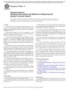 ASTM D6399-18 is a guide published by ASTM International. Its full title is "Standard Guide for Selecting Instruments and Methods for Measuring Air Quality in Aircraft Cabins". This standard covers: SIGNIFICANCE AND USE 5.1 This guide may be used to identify instruments and methods for measuring air quality in aircraft cabins. Such measurements may be undertaken to: 5.1.1 Conduct monitoring surveys to characterize the aircraft cabin environment and to assess environmental conditions. Results of such measurements could then be compared with relevant standards or guidelines for assessment of health and comfort of passengers and flight attendants. 5.1.2 Investigate passenger and flight attendant complaints; or 5.1.3 Measure and compare the performance of new materials and systems for the aircraft cabin environment. SCOPE 1.1 This guide covers information and guidance for the selection of instrumentation and test methods for measuring air quality in aircraft passenger cabins as well as in areas limited to flightcrew access. 1.2 This guide assumes that a list of pollutants to be measured, or analytes of interest, which are present, or may be present, in aircraft cabins is available. 1.3 This guide provides information and guidance to identify levels of concern pertaining to public and occupational exposures to relevant air pollutants. This guide does not address levels of concern, if any, related to degradation of materials or aircraft components because of the presence of air pollutants. 1.4 Based on levels of concern for public and occupational exposures for each pollutant of interest, this guide provides recommendations for developing three aspects of data quality objectives (a) detection limit; (b) precision; and (c) bias. 1.5 This guide summarizes information on technologies for measurement of different groups or classes of air pollutants to provide a basis for selection of instruments and methods. The guide also identifies information resources on types of available measurement systems. 1.6 This guide provides general recommendations for selection of instruments and methods. These recommendations are based on concepts associated with data quality objectives discussed in this guide and the information on available instruments and methods summarized in this guide. 1.7 This guide is specific to chemical contaminants and does not address bioaerosols, which may be present in the cabin environment. 1.8 This guide does not provide details on use or operation of instruments or methods for the measurement of cabin air quality. 1.9 This guide does not provide information on the design of a monitoring strategy, including issues such as frequency of measurement or placement of samplers. 1.10 Users of this guide should be familiar with, or have access to, individuals who have a background in (a) use of instruments and methods for measurement of air pollutants and (b) principles of toxicology and health-effects of environmental exposure to air pollutants. 1.11 The values stated in SI units are to be regarded as standard. No other units of measurement are included in this standard. 1.12 This standard does not purport to address all of the safety concerns, if any, associated with its use. It is the responsibility of the user of this standard to establish appropriate safety, health, and environmental practices and determine the applicability of regulatory limitations prior to use. 1.13 This international standard was developed in accordance with internationally recognized principles on standardization established in the Decision on Principles for the Development of International Standards, Guides and Recommendations issued by the World Trade Organization Technical Barriers to Trade (TBT) Committee.
