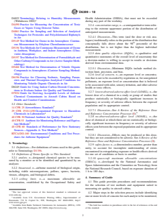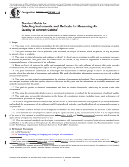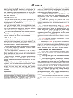 SIGNIFICANCE AND USE 5.1 This guide may be used to identify instruments and methods for measuring air quality in aircraft cabins. Such measurements may be undertaken to: 5.1.1 Conduct monitoring surveys to characterize the aircraft cabin environment and to assess environmental conditions. Results of such measurements could then be compared with relevant standards or guidelines for assessment of health and comfort of passengers and flight attendants. 5.1.2 Investigate passenger and flight attendant complaints; or 5.1.3 Measure and compare the performance of new materials and systems for the aircraft cabin environment. SCOPE 1.1 This guide covers information and guidance for the selection of instrumentation and test methods for measuring air quality in aircraft passenger cabins as well as in areas limited to flightcrew access. 1.2 This guide assumes that a list of pollutants to be measured, or analytes of interest, which are present, or may be present, in aircraft cabins is available. 1.3 This guide provides information and guidance to identify levels of concern pertaining to public and occupational exposures to relevant air pollutants. This guide does not address levels of concern, if any, related to degradation of materials or aircraft components because of the presence of air pollutants. 1.4 Based on levels of concern for public and occupational exposures for each pollutant of interest, this guide provides recommendations for developing three aspects of data quality objectives (a) detection limit; (b) precision; and (c) bias. 1.5 This guide summarizes information on technologies for measurement of different groups or classes of air pollutants to provide a basis for selection of instruments and methods. The guide also identifies information resources on types of available measurement systems. 1.6 This guide provides general recommendations for selection of instruments and methods. These recommendations are based on concepts associated with data quality objectives discussed in this guide and the information on available instruments and methods summarized in this guide. 1.7 This guide is specific to chemical contaminants and does not address bioaerosols, which may be present in the cabin environment. 1.8 This guide does not provide details on use or operation of instruments or methods for the measurement of cabin air quality. 1.9 This guide does not provide information on the design of a monitoring strategy, including issues such as frequency of measurement or placement of samplers. 1.10 Users of this guide should be familiar with, or have access to, individuals who have a background in (a) use of instruments and methods for measurement of air pollutants and (b) principles of toxicology and health-effects of environmental exposure to air pollutants. 1.11 The values stated in SI units are to be regarded as standard. No other units of measurement are included in this standard. 1.12 This standard does not purport to address all of the safety concerns, if any, associated with its use. It is the responsibility of the user of this standard to establish appropriate safety, health, and environmental practices and determine the applicability of regulatory limitations prior to use. 1.13 This international standard was developed in accordance with internationally recognized principles on standardization established in the Decision on Principles for the Development of International Standards, Guides and Recommendations issued by the World Trade Organization Technical Barriers to Trade (TBT) Committee.