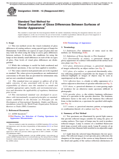 ASTM D4449-15(2021) is a standard published by ASTM International. Its full title is "Standard Test Method for Visual Evaluation of Gloss Differences Between Surfaces of Similar Appearance". This standard covers: SIGNIFICANCE AND USE 5.1 Gloss3 is associated with the capacity of a surface to reflect more light in some directions than in others. The directions associated with mirror (or specular) reflection normally have the highest reflectances. Gloss is best seen and analyzed when the surfaces studied are illuminated by a light source that provides strong contrasting patterns of light and dark. Such a light source is described in this test method. 5.2 The simplest concept of gloss is that it corresponds to the mirror-like reflectances of surfaces. However, the distributions and intensities of this surface-reflected light are (for real materials) highly variable and affected by a variety of factors: surface smoothness and contour, refractive index, absorptance, angle of incidence, and (to a generally small extent) wavelength. From the great variety of surface-reflection patterns met in materials of commerce, it has been possible to identify seven surface-reflection criteria or “types of gloss” regularly used by skilled technologists for intercomparing and rating their products for gloss. Six of the seven criteria, or “types of gloss,” are identified in the section on definitions. The seventh, luster or contrast gloss, is seldom of concern to the coatings industry. SCOPE 1.1 This test method covers the visual evaluation of gloss differences of coating surfaces, using special types of lamps for illumination. It identifies six aspects or types of gloss that one may look for when using the lamp to assess gloss differences between surfaces. It describes the conditions for using the lamps to best identify small differences in each of the six types of gloss. Four levels of visual gloss differences are distinguished. 1.2 While this technique is useful for both weathered and unweathered specimens, it has not been applied to metallics. 1.3 The values stated in inch-pound units are to be regarded as standard. The values given in parentheses are mathematical conversions to SI units that are provided for information only and are not considered standard. 1.4 This standard does not purport to address all of the safety concerns, if any, associated with its use. It is the responsibility of whoever uses this standard to consult and establish appropriate safety, health, and environmental practices and determine the applicability of regulatory limitations prior to use. 1.5 This international standard was developed in accordance with internationally recognized principles on standardization established in the Decision on Principles for the Development of International Standards, Guides and Recommendations issued by the World Trade Organization Technical Barriers to Trade (TBT) Committee.