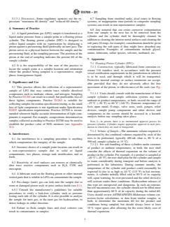 SIGNIFICANCE AND USE 5.1 This practice allows the collection of a representative sample of LPG that may contain trace volatile dissolved components such as methane, ethane, and nitrogen. Sampling by Practice D1265 can result in a small, but predictable, loss of these lighter components. Practice D1265 is suitable for collecting samples for routine specification testing, as the small loss of light components is not significant under Specification D1835 specification requirements. Practice D3700 is recommended whenever highly accurate determination of light components is required. For example, compositions determined on samples collected according to Practice D3700 may be used to establish the product value of NGL mixtures (see Appendix X1). SCOPE 1.1 This practice covers the equipment and procedures for obtaining a representative sample of liquefied petroleum gas (LPG), such as specified in ASTM Specification D1835, GPA 2140, and comparable international standards. It may also be used for other natural gas liquid (NGL) products that are normally single phase (for example, NGL mix, field butane, and so forth), defined in other industry specifications or contractual agreements, and for volatile (higher vapor pressure) crude oils. Note 1: Some floating piston cylinders have such tight piston seals that the vapor pressure of some high vapor pressure crude oils may not be sufficient to allow sampling without a handle to move the piston. An alternative sampling practice for UN Class 3 liquids (under 300 kPa at 52 °C) is Practice D8009, which utilizes a Manual Piston Cylinder (MPC) sampler. 1.2 This practice is not intended for non-specification products that contain significant quantities of undissolved gases (N2, CO2), free water or other separated phases, such as raw or unprocessed gas/liquids mixtures and related materials. The same equipment can be used for these purposes, but additional precautions are generally needed to obtain representative samples of multi-phase products (see Appendix X1). 1.3 This practice includes recommendations for the location of a sample point in a line or vessel. It is the responsibility of the user to ensure that the sampling point is located so as to obtain a representative sample. 1.4 The values stated in SI units are to be regarded as standard. 1.4.1 Exception—The values given in parentheses are for information only. 1.5 This standard does not purport to address all of the safety concerns, if any, associated with its use. It is the responsibility of the user of this standard to establish appropriate safety, health, and environmental practices, and determine the applicability of regulatory limitations prior to use. 1.6 This international standard was developed in accordance with internationally recognized principles on standardization established in the Decision on Principles for the Development of International Standards, Guides and Recommendations issued by the World Trade Organization Technical Barriers to Trade (TBT) Committee.