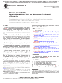 ASTM C138/C138M-23 is a standard published by ASTM International. Its full title is "Standard Test Method for Density (Unit Weight), Yield, and Air Content (Gravimetric) of Concrete". This standard covers: ABSTRACT This test method covers determination of the density of freshly mixed concrete and gives formulas for calculating the unit weight, yield or relative yield, cement content, and air content of the concrete. Yield is defined as the volume of concrete produced from a mixture of known quantities of the component materials. The test method shall use the following apparatuses: balance or scale; tamping rod, which is a round straight steel rod having the tamping end rounded to a hemispherical tip; internal vibrator which may have rigid of flexible shafts, preferably powered by electric motors; measure, which is a cylindrical container made of steel or other suitable metal specified herein; strike-off plate; mallet; and scoop of a size large enough so each amount of concrete obtained from the sampling receptacle is representative and small enough so it is not spilled during placement in the measure. SCOPE 1.1 This test method covers determination of the density (see Note 1) of freshly mixed concrete and gives formulas for calculating the yield, cement content, and air content of the concrete. Yield is defined as the volume of concrete produced from a mixture of known quantities of the component materials. 1.2 The values stated in either SI units or inch-pound units are to be regarded separately as standard. The values stated in each system may not be exact equivalents; therefore, each system shall be used independently of the other. Combining values from the two systems may result in non-conformance with the standard. Note 1: Unit weight was the previous terminology used to describe the property determined by this test method, which is mass per unit volume. 1.3 The text of this test method refers to notes and footnotes that provide explanatory material. These notes and footnotes (excluding those in tables and figures) shall not be considered as requirements of this standard. 1.4 This standard does not purport to address all of the safety concerns, if any, associated with its use. It is the responsibility of the user of this standard to establish appropriate safety, health, and environmental practices and determine the applicability of regulatory limitations prior to use.(Warning—Fresh hydraulic cementitious mixtures are caustic and may cause chemical burns to skin and tissue upon prolonged exposure.2) 1.5 This international standard was developed in accordance with internationally recognized principles on standardization established in the Decision on Principles for the Development of International Standards, Guides and Recommendations issued by the World Trade Organization Technical Barriers to Trade (TBT) Committee.