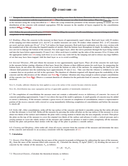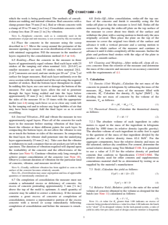ABSTRACT This test method covers determination of the density of freshly mixed concrete and gives formulas for calculating the unit weight, yield or relative yield, cement content, and air content of the concrete. Yield is defined as the volume of concrete produced from a mixture of known quantities of the component materials. The test method shall use the following apparatuses: balance or scale; tamping rod, which is a round straight steel rod having the tamping end rounded to a hemispherical tip; internal vibrator which may have rigid of flexible shafts, preferably powered by electric motors; measure, which is a cylindrical container made of steel or other suitable metal specified herein; strike-off plate; mallet; and scoop of a size large enough so each amount of concrete obtained from the sampling receptacle is representative and small enough so it is not spilled during placement in the measure. SCOPE 1.1 This test method covers determination of the density (see Note 1) of freshly mixed concrete and gives formulas for calculating the yield, cement content, and air content of the concrete. Yield is defined as the volume of concrete produced from a mixture of known quantities of the component materials. 1.2 The values stated in either SI units or inch-pound units are to be regarded separately as standard. The values stated in each system may not be exact equivalents; therefore, each system shall be used independently of the other. Combining values from the two systems may result in non-conformance with the standard. Note 1: Unit weight was the previous terminology used to describe the property determined by this test method, which is mass per unit volume. 1.3 The text of this test method refers to notes and footnotes that provide explanatory material. These notes and footnotes (excluding those in tables and figures) shall not be considered as requirements of this standard. 1.4 This standard does not purport to address all of the safety concerns, if any, associated with its use. It is the responsibility of the user of this standard to establish appropriate safety, health, and environmental practices and determine the applicability of regulatory limitations prior to use.(Warning—Fresh hydraulic cementitious mixtures are caustic and may cause chemical burns to skin and tissue upon prolonged exposure.2) 1.5 This international standard was developed in accordance with internationally recognized principles on standardization established in the Decision on Principles for the Development of International Standards, Guides and Recommendations issued by the World Trade Organization Technical Barriers to Trade (TBT) Committee.