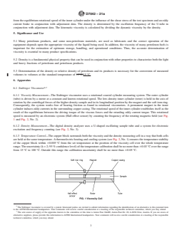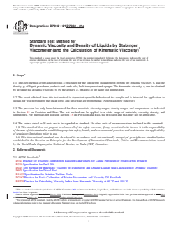 SIGNIFICANCE AND USE 5.1 Many petroleum products, and some non-petroleum materials, are used as lubricants and the correct operation of the equipment depends upon the appropriate viscosity of the liquid being used. In addition, the viscosity of many petroleum fuels is important for the estimation of optimum storage, handling, and operational conditions. Thus, the accurate determination of viscosity is essential to many product specifications. 5.2 Density is a fundamental physical property that can be used in conjunction with other properties to characterize both the light and heavy fractions of petroleum and petroleum products. 5.3 Determination of the density or relative density of petroleum and its products is necessary for the conversion of measured volumes to volumes at the standard temperature of 15 °C. SCOPE 1.1 This test method covers and specifies a procedure for the concurrent measurement of both the dynamic viscosity, η, and the density, ρ, of liquid petroleum products and crude oils, both transparent and opaque. The kinematic viscosity, ν, can be obtained by dividing the dynamic viscosity, η, by the density, ρ, obtained at the same test temperature. 1.2 The result obtained from this test method is dependent upon the behavior of the sample and is intended for application to liquids for which primarily the shear stress and shear rate are proportional (Newtonian flow behavior). 1.3 The precision has only been determined for those materials, viscosity ranges, density ranges, and temperatures as indicated in Section 15 on Precision and Bias. The test method can be applied to a wider range of materials, viscosity, density, and temperature. For materials not listed in Section 15 on Precision and Bias, the precision and bias may not be applicable. 1.4 The values stated in SI units are to be regarded as standard. No other units of measurement are included in this standard. 1.5 This standard does not purport to address all of the safety concerns, if any, associated with its use. It is the responsibility of the user of this standard to establish appropriate safety, health, and environmental practices and to determine the applicability of regulatory limitations prior to use. 1.6 This international standard was developed in accordance with internationally recognized principles on standardization established in the Decision on Principles for the Development of International Standards, Guides and Recommendations issued by the World Trade Organization Technical Barriers to Trade (TBT) Committee.