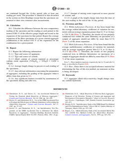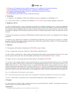 SIGNIFICANCE AND USE 4.1 This test method provides a means of detecting the potential of an aggregate intended for use in concrete for undergoing alkali-silica reaction resulting in potentially deleterious internal expansion. It is based on the NBRI Accelerated Test Method (1-4).3 It is especially useful for aggregates that react slowly or produce expansion late in the reaction. However, it does not evaluate combinations of aggregates with cementitious materials nor are the test conditions representative of those encountered by concrete in service. 4.2 Because the specimens are exposed to a NaOH solution, the alkali content of the cement is not a significant factor in affecting expansions. 4.3 Results of tests conducted on an aggregate as described herein should form a part of the basis for a decision as to whether precautions should be taken against excessive expansion due to alkali-silica reaction. Refer to Guide C1778 for the interpretation of the test results from Test Method C1260. SCOPE 1.1 This test method permits detection, within 16 days, of the potential for deleterious alkali-silica reaction of aggregate in mortar bars. 1.2 The values stated in SI units are to be regarded as standard. No other units of measurement are included in this standard. When this test method refers to combined-unit standards, the selection of the measurement systems is at the user’s discretion. 1.3 The text of this test method refers to notes and footnotes that provide explanatory material. These notes and footnotes (excluding those in tables and figures) shall not be considered as requirements of this test method. 1.4 This standard does not purport to address all of the safety concerns, if any, associated with its use. It is the responsibility of the user of this standard to establish appropriate safety, health, and environmental practices and determine the applicability of regulatory limitations prior to use. A specific precautionary statement is given in the section on Reagents. 1.5 This international standard was developed in accordance with internationally recognized principles on standardization established in the Decision on Principles for the Development of International Standards, Guides and Recommendations issued by the World Trade Organization Technical Barriers to Trade (TBT) Committee.